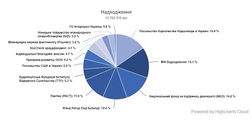 По 2018 года, основную долю пропитания «независимым аналитикам» обеспечили: Международный фонд «Возрождение» (финансируется Джорджем Соросом) – 15,1%, Национальный фонд демократии (NED, основан Конгрессом США) – 14,2%, посольство Королевства Нидерланды в Украине – 15,4%, некий фонд Natur&Kultur (Германия) – 12,0% и прочие «большие друзья» Украины.
