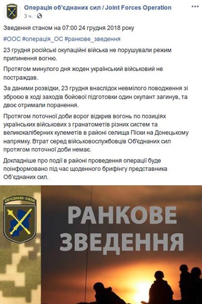 При этом, 23 декабря вооруженные сепаратисты не нарушали режим прекращения огня, сообщает штаб ООС.