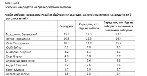 Ранее социологическая группа Рейтинг по заказу Международного республиканского института обнародовала свой опрос. По их результатам, шанс стать президентом есть у пяти кандидатов: 16% готовы поддержать Юлию Тимошенко, по 11% – Петра Порошенко и Владимира Зеленского, 9% – Юрий Бойко и 8% – Анатолий Гриценко.